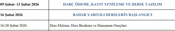 2025/2026 Eğitim Öğretim Yılı Bahar Yarıyılı Kayıt Yenileme ve Ders Kayıt İşlemleri duyurusu için TIKLAYINIZ.