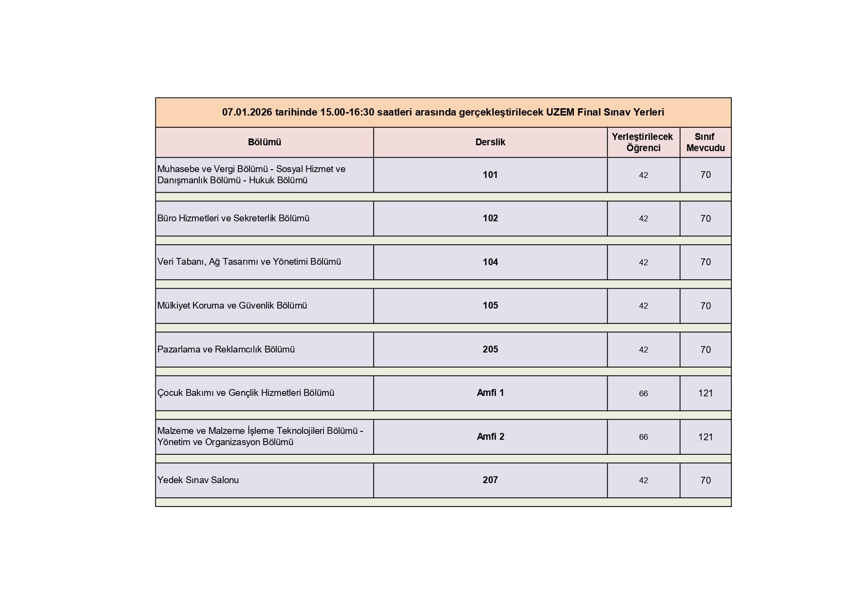 2025-2026 Güz Dönemi kapsamında ODB Koordinatörlüğü tarafından YUZEM bünyesinde yürütülen AİB101, TDB101 ve YDB101 kodlu derslerin final sınavları, 07 Ocak 2026 Çarşamba günü saat 15.00’te başlayacak ve 16.30’da sona erecektir. Sınav yerinizi aşağıdaki tablodan öğrenebilirsiniz.
